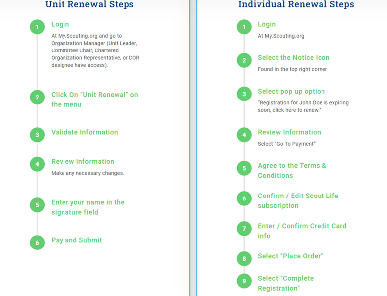 All Membership in the BSA will be renewed on a 12-month membership cycle. Each member will renew their membership on their anniversary month. Many will have an anniversary that is the month their unit renewed last, and any new members will renew 12 months after they joined. Membership renewals will be completed either by credit card with a 12-month renewal payment from individual, by a scout unit that has elected “Unit will pay all our members renewals” option, or by a manual payment at the Council Office. Adult registrations will still need to be done through the Council office.
